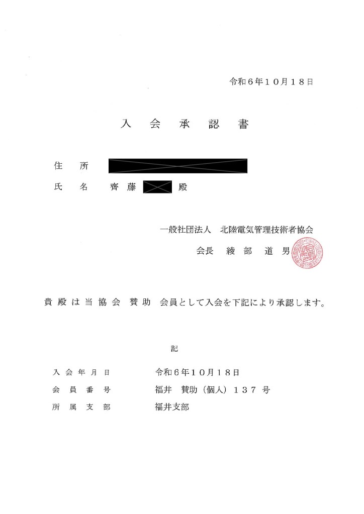 10月18日付で一般社団法人北陸電気管理技術者協会様に賛助会員として入会いたしました。他会員様の年次点検の応援等も請け負いますのでお問い合わせフォームより気軽にお問い合わせください。